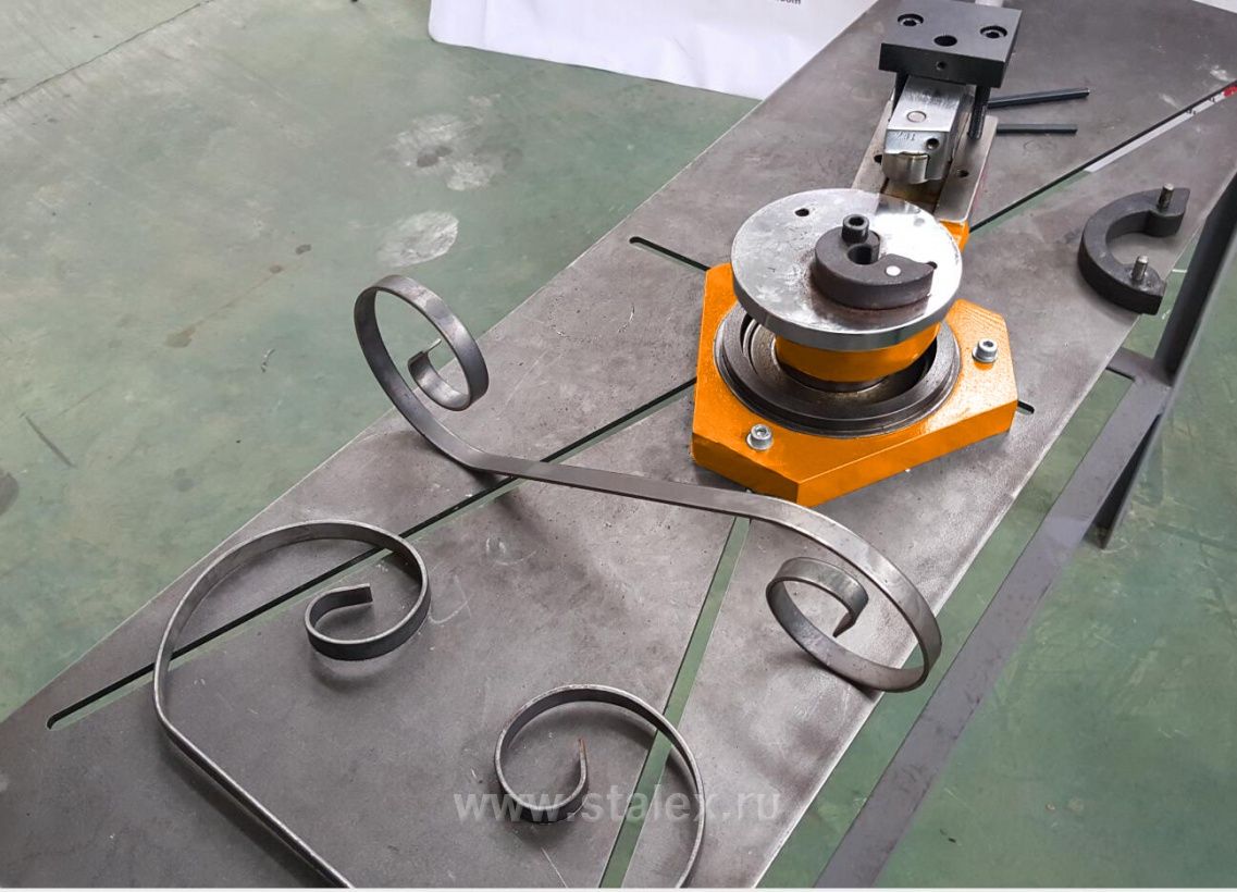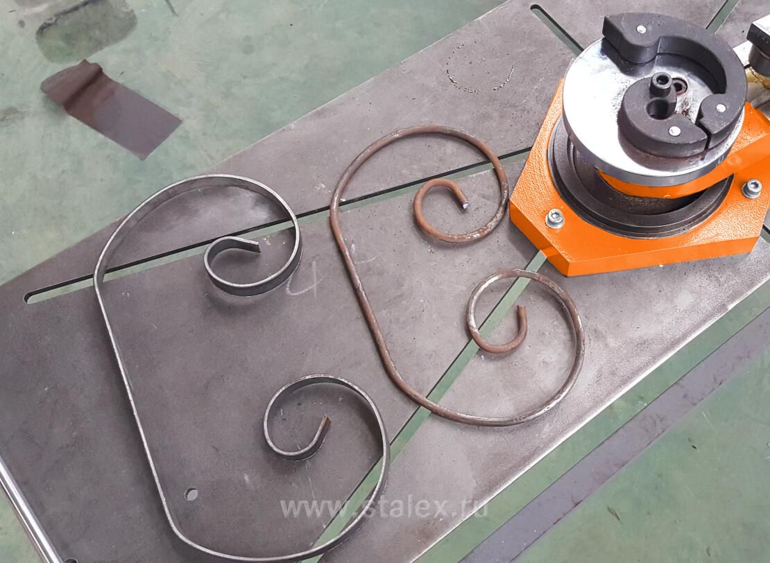 Универсальность обработки. Станок позволяет выполнять гибку, накатку, изготовление обручей, витков и колец из металлических заготовок различного профиля . В зависимости от установленной оснастки можно получать радиусные элементы, угловые соединения или декоративные завитки .
