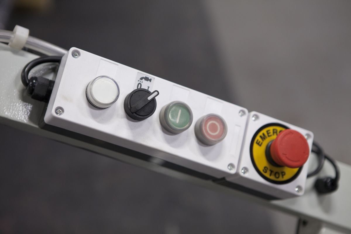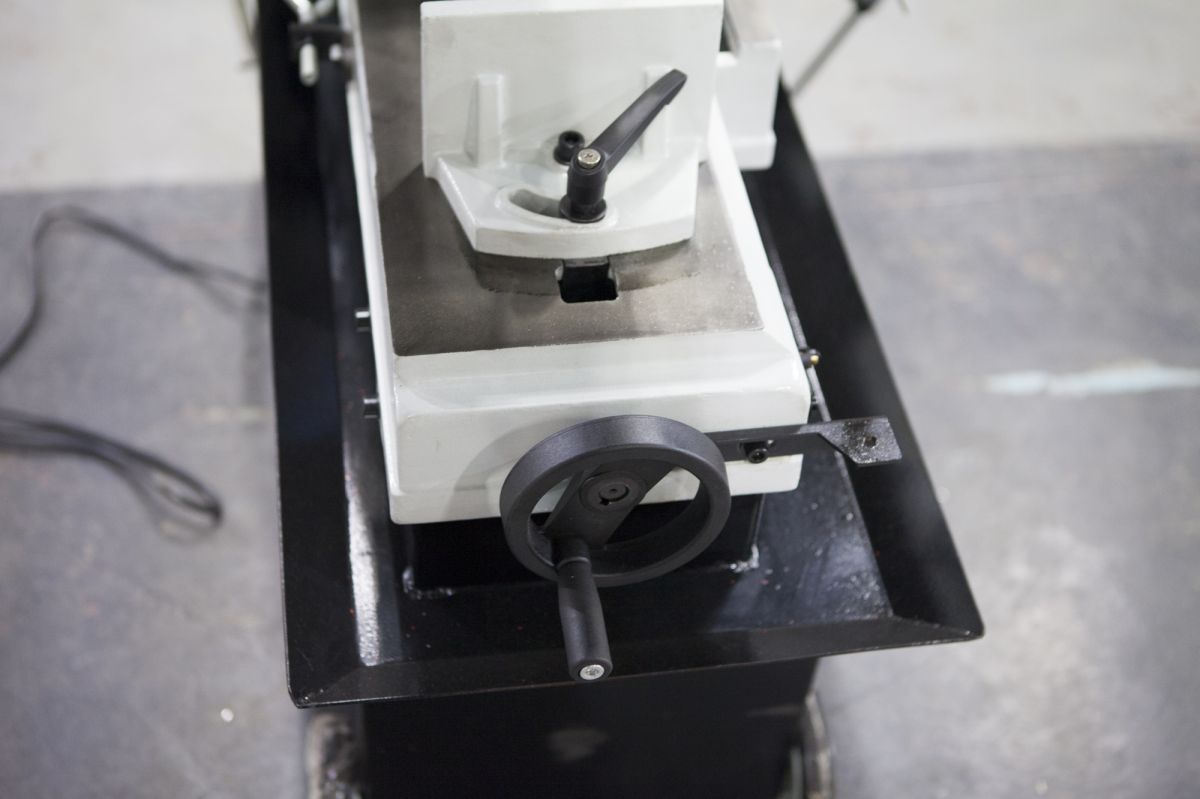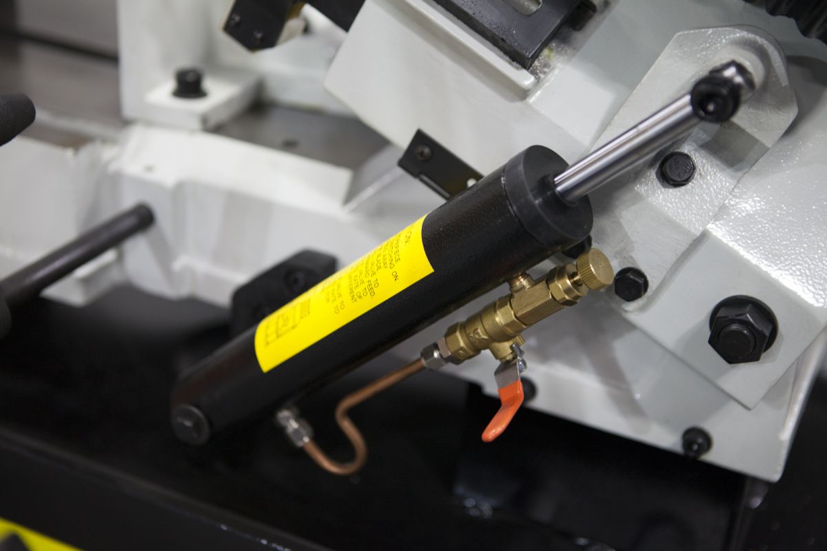 На станках с гидроразгрузкой управление и процесс резки (запуск пилы – опускание рамы – остановка пилы) происходит за счёт запуска двигателя и регулировки гидроцилиндра. Гидроцилиндр имеет переключатель вкл./выкл. гидравлической системы и плавную регулировку опускания рамы верхним маховиком на дроссельном клапане.