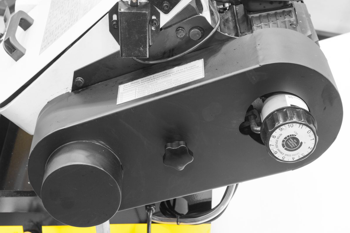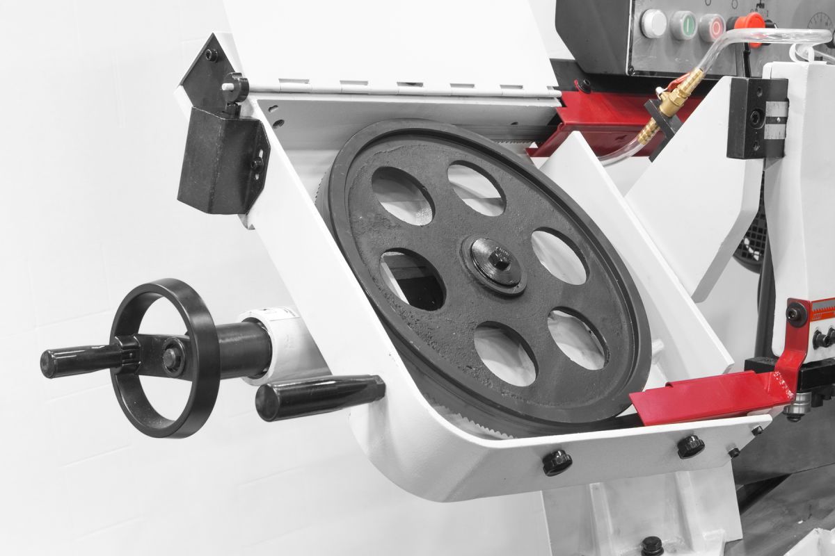 Ручное натяжение ленты, маховик со встроенной шкалой позволяет быстро и легко производить натяжение пильной ленты. Концевики отключающие станок, при поднятии крышек маховика вращения полотна