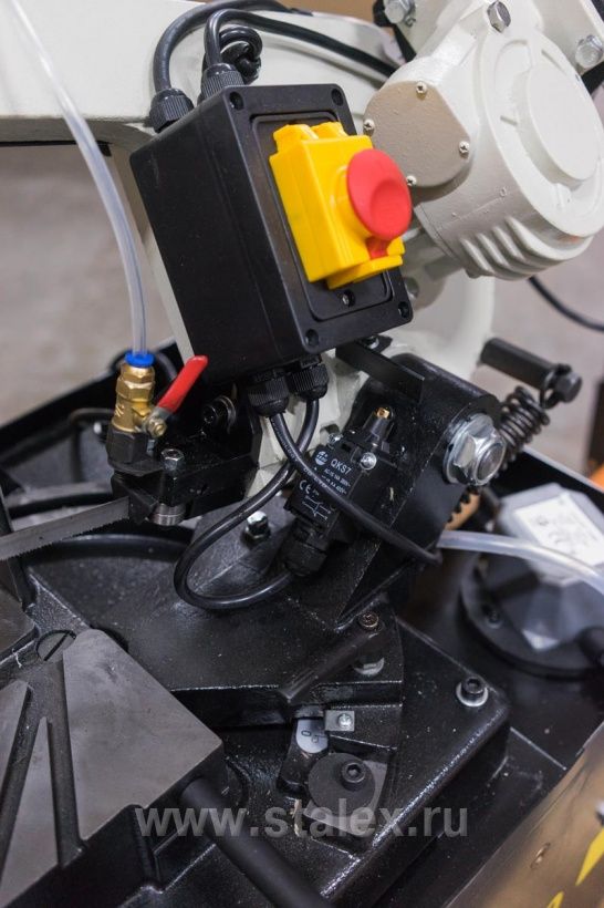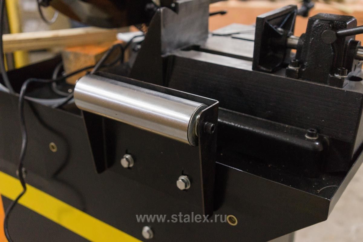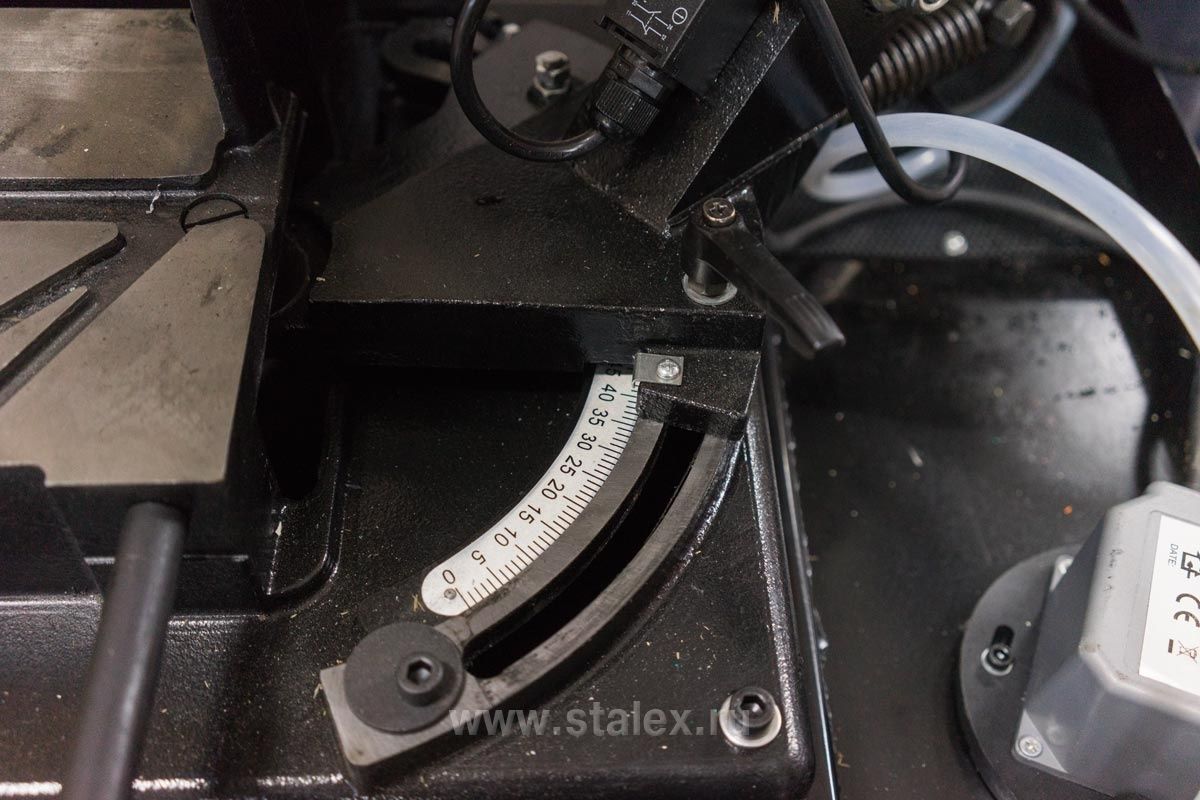 В рабочей зоне резания полотно точно ведется двумя направляющими головками. Станок европейского образца с возможностью поворота корпуса пилы от 0° до +45° и +60° (поградусно), предназначен для пиления заготовок, под различными углами и при частой смене угла пила.