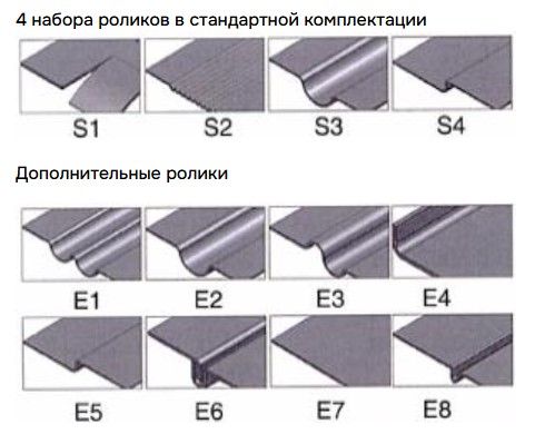 Ответ: В комплекте 4 набора стандартных роликов для закатки кромок, отбортовки, изготовления S-образного профиля и отделки торцов.